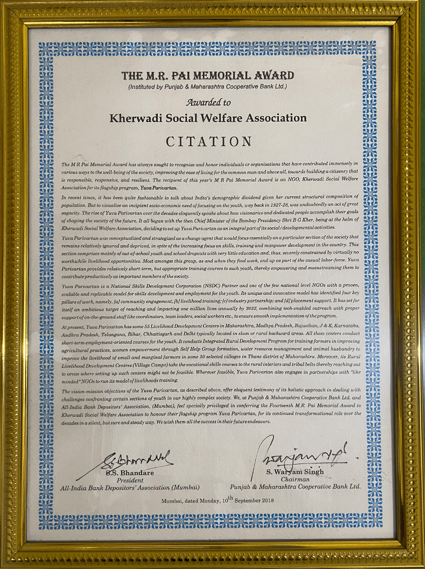 Punjab & Maharashtra Co-operative Bank Ltd (PMC Bank) instituted prestigious ‘M R Pai Memorial Award’ for the year 2018 was presented to Kherwadi Social Welfare Association for its flagship program – YUVA PARIVARTAN. The award given at the annual event held in Mumbai consisted a cheque of Rs. 2.50 Lakh and Citation. The award was presented by Chief Guest Dr. Ashima Goyal – Professor Indira Gandhi Institute of Development Research & Member of the Prime Minister’s Economic Advisory Council to Mr Kishor Kher – Founder of Kherwadi Social Welfare Association. M R Pai Memorial Award is given to the outstanding Activist/Journalist or Social Organization for its significant contribution towards the betterment of citizens.